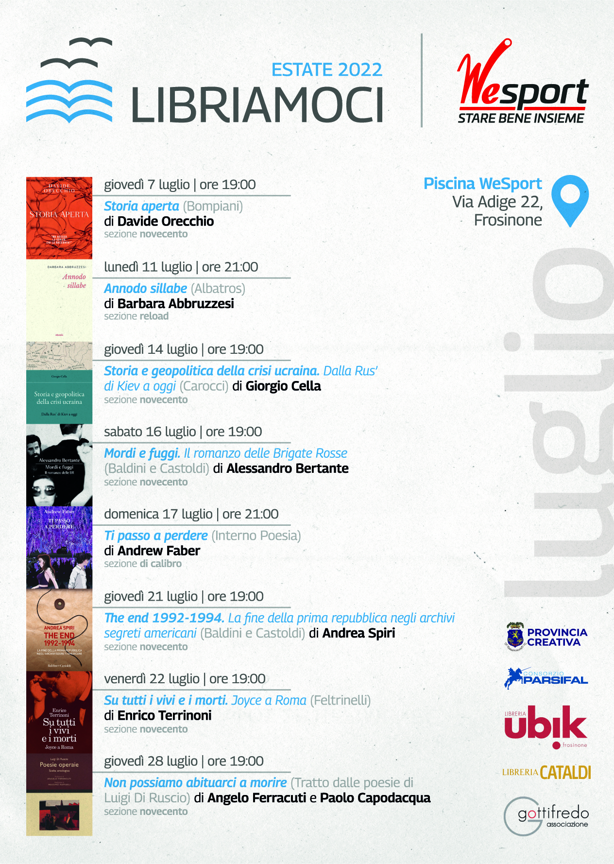 Giovedì 7 luglio, alle ore 19:00, si terrà il primo appuntamento di Libriamoci, la rassegna libraria che quest’estate consentirà di incontrare gli autori del momento e di avere uno spazio per riflettere insieme a loro. La piscina comunale WeSport di Frosinone ospiterà infatti la presentazione del romanzo Storia aperta (Bompiani, 2022) di Davide Orecchio.