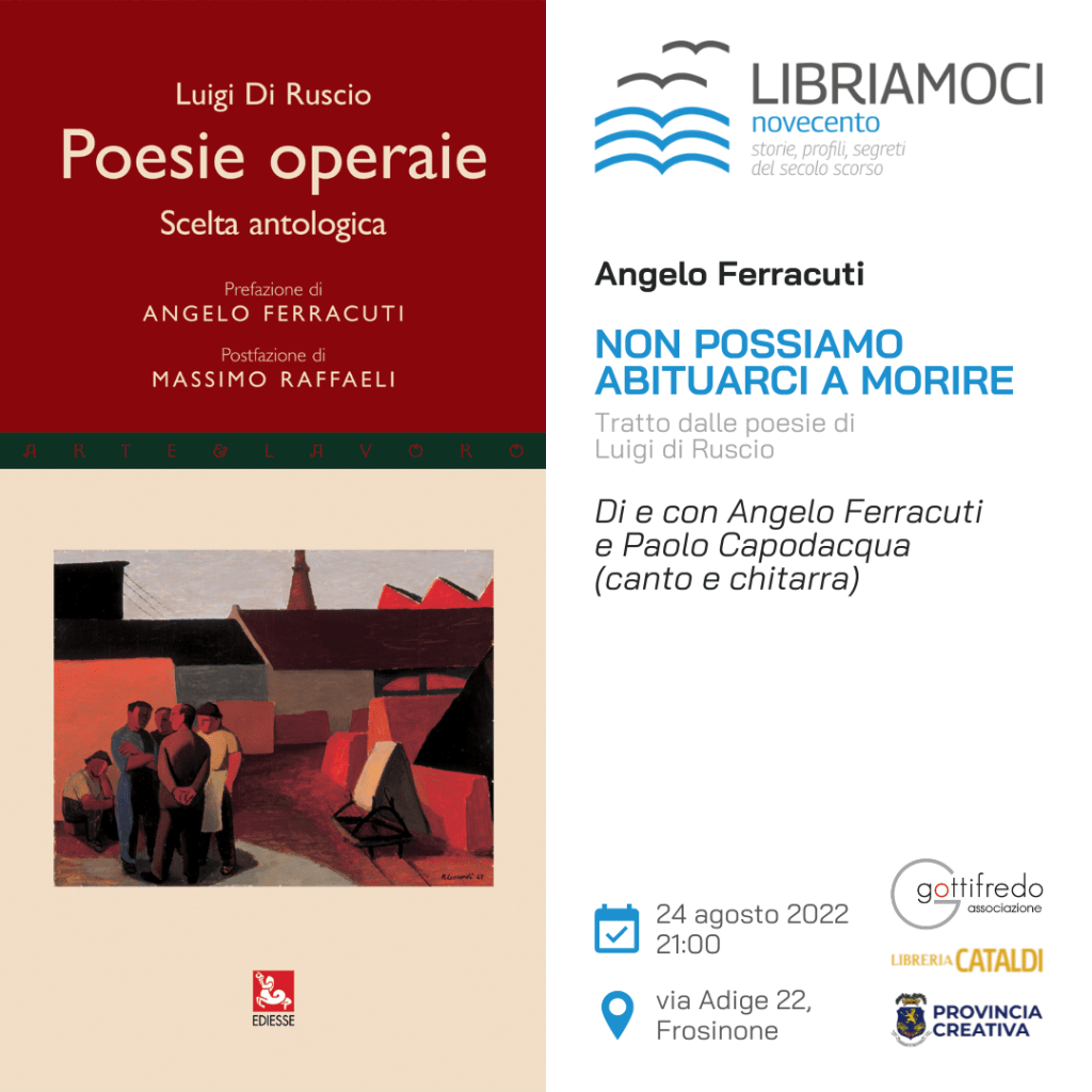 Dopodomani, alle ore 21:00, Angelo Ferracuti racconterà Luigi Di Ruscio, con ricordi, riflessioni, lettura di poesie del grande poeta e scrittore “operaio” accompagnate dalle musiche e dai canti di Paolo Capodacqua.