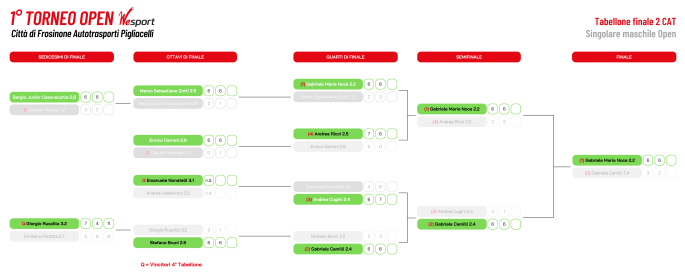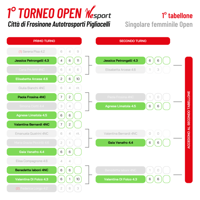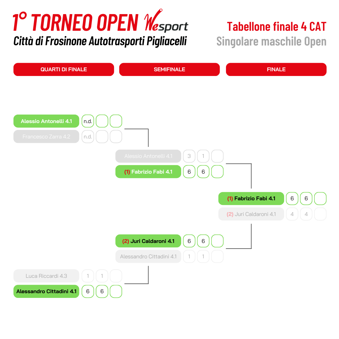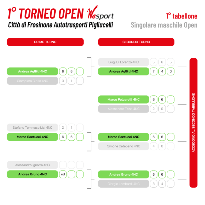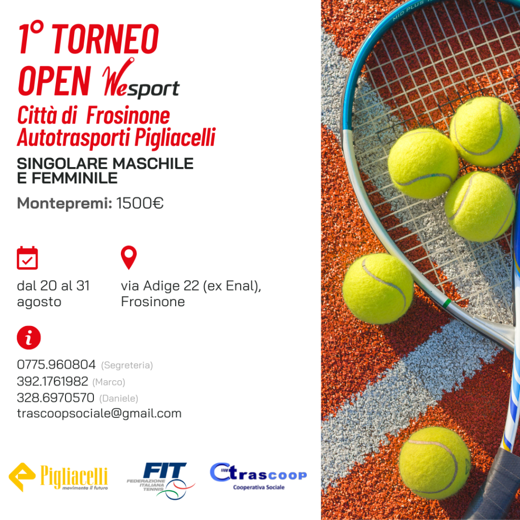 Dal 20 agosto al 4 settembre*, si è svolto presso il nostro circolo il 1° Torneo Open WeSport Città di Frosinone Autotrasporti Pigliacelli. A vincere la competizione maschile è stato il ciociaro Gabriele Maria Noce (rank 2.2 e numero 916 nella classifica Atp), mentre il titolo femminile è andato a Irina Michela Furtuna (rank 2.5).