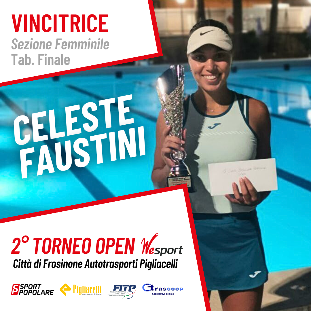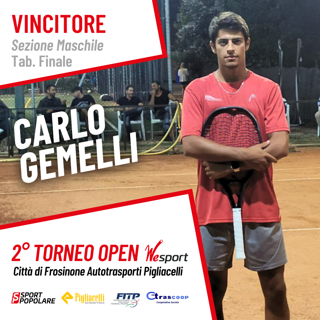 Si è conclusa giovedì sera la seconda edizione dell’Open WeSport Città di Frosinone Autotrasporti Pigliacelli sugli storici campi in terra rossa del circolo sportivo WeSport Frosinone (ex Enal di Via Adige). Il titolo maschile è andato a Carlo Gemelli (2.5) del Mediterraneo Sporting Club di San Gregorio di Catania che in finale ha battuto in due set (6-3, 6-1) il ciociaro Enrico Cerroni (2.5) dell’Asd Garden 77 di Taranto. Nel femminile ha trionfato la frusinate Celeste Faustini (2.5) del Tennis Club Parioli che ha superato in due set (6-2, 6-3) la campionessa uscente Irina Michela Furtuna (2.5).