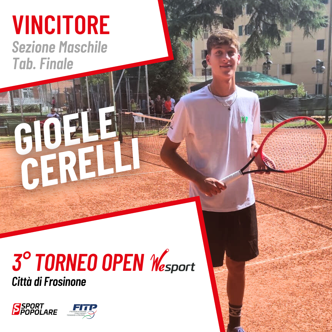 Si è conclusa sabato la terza edizione del torneo Open WeSport Città di Frosinone. Due giovanissimi hanno trionfato sugli storici campi in terra rossa del circolo Sport Popolare presso il centro sportivo WeSport Frosinone (ex Enal di Via Adige). Il titolo maschile è andato al verolano Gioele Cerelli (ranking 2.6) che in finale si è imposto sulla testa di serie numero uno Edoardo Monti (ranking 2.3) al termine di una grande rimonta. Il tennista in forza al circolo Colle degli Dei di Velletri ha concesso il primo set al romano (1-6), ribaltando poi il risultato nei successivi due set vinti 6-3, 6-4. Una grande prova per il giovane classe 2008, premiato a fine match dal consigliere delegato allo Sport del Comune di Frosinone Francesco Pallone, e dai rappresentanti di WeSport, Giuseppe Gualdini e Daniele Sistopaoli. Non si è giocata, invece, la finale dell’Open femminile a causa del forfait di Gioia Fabi (ranking 3.2) dell’Asd Park Club di Alatri. Il titolo è stato così assegnato alla promettente Under 14 Angela Goglia (ranking 2.7) dell’Accademies Tennis e Padel Asd di Giugliano in Campania.
