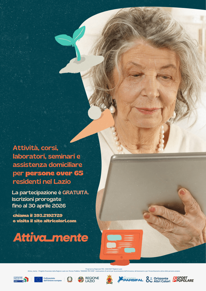 È stata prorogata fino al 30 aprile 2026 la scadenza del bando per partecipare ad Attiva_mente, il progetto gratuito dedicato agli over 65 pensato per promuovere il benessere, l’invecchiamento attivo e contrastare l’isolamento sociale. L’iniziativa, finanziata dalla Regione Lazio nell’ambito del Programma Regionale FSE+ 2021/2027, nasce dalla collaborazione tra Orizzonte Altri Colori, Consorzio Parsifal e Sport Popolare, in partenariato con il Comune di Frosinone e una rete di soggetti pubblici e privati.