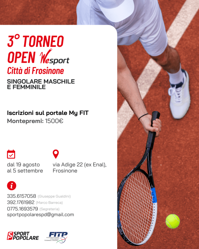 Sabato 19 agosto prenderà il via la seconda edizione del Torneo Open WeSport Città di Frosinone Autotrasporti Pigliacelli sugli storici campi da tennis in terra rossa del circolo sportivo WeSport Frosinone (ex Enal di Via Adige). L’attesa kermesse – che si concluderà il 3 settembre – prevede un tabellone maschile e uno femminile con un montepremi complessivo di 1.500 euro equamente distribuito tra le due categorie.