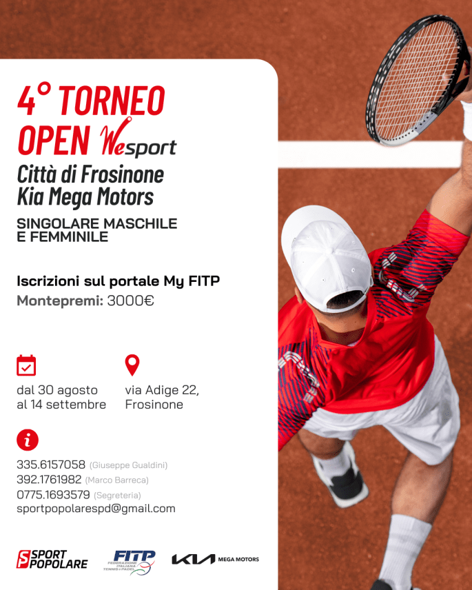 Cresce l’attesa per la quarta edizione del Torneo Open WeSport Città di Frosinone Kia Mega Motors, che prenderà ufficialmente il via sabato 30 agosto sui campi in terra rossa dello storico circolo Sport Popolare, all’interno del centro sportivo WeSport Frosinone di via Adige.