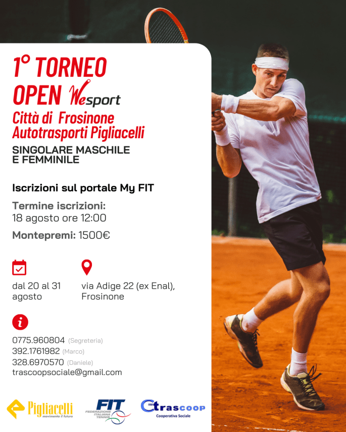 Cresce l’attesa per il 1° Torneo Open WeSport Città di Frosinone Autotrasporti Pigliacelli che si terrà presso il circolo sportivo WeSport Frosinone (ex Enal di Via Adige) dal 20 al 31 agosto.