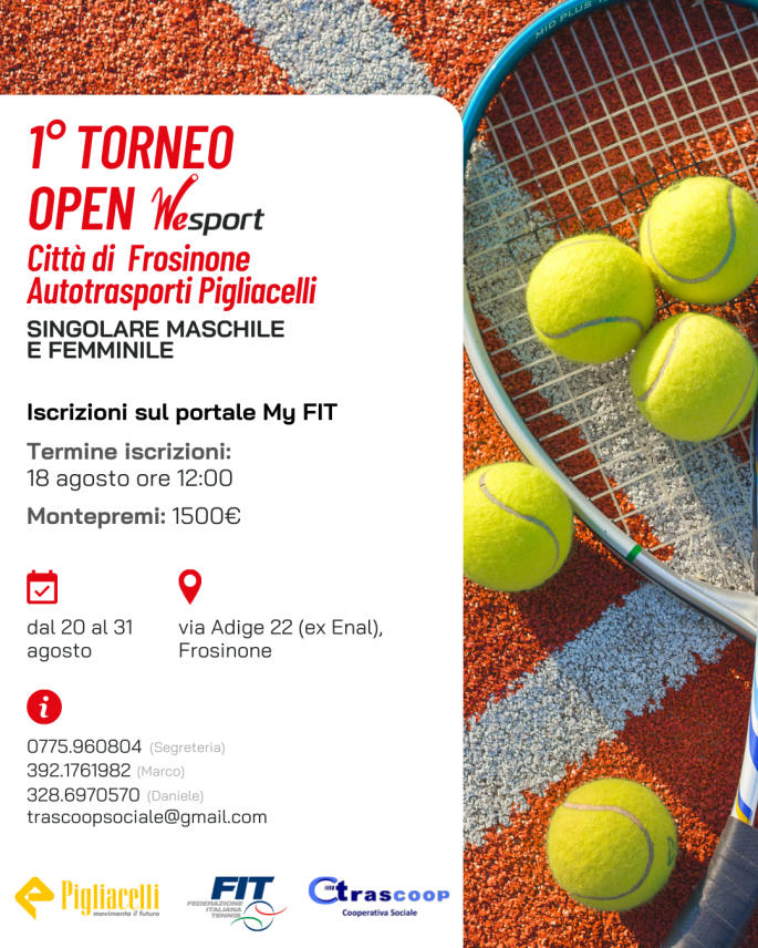 Sabato 20 agosto prenderà il via il 1° Torneo Open WeSport Città di Frosinone Autotrasporti Pigliacelli sugli storici campi da tennis in terra rossa del circolo sportivo WeSport Frosinone (ex Enal di Via Adige).